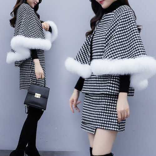 美脚効果抜群のハイウエストのミニスカにトップスは気になる部分を隠しつつシルエットがスッキリ見えるポンチョタイプ◎細かいチェック柄とファーがポイント!守ってあげたくなる可愛い女性を演出してくれます♪